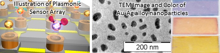高誘電体からなるナノフォトニック構造や、金属内の自由電子の集団振動を空間的に制御したプラズモニック材料を用いれば、局所に光のエネルギーを集中させることができ、例えば、高効率な光エネルギー変換材料、高速・高効率発光体、光回路、超高感度でポータブルなセンサーが実現できると考えられています。この技術により、超高速通信や、省電力なポータブル機器、現場での汚染物質の検出、簡便で高感度な病理診断技術の実現が期待されています。当グループでは、自己組織化やリソグラフィーを応用した自由電子の空間制御のみならず、組成や結晶組織など電子のエネルギーやメゾスコピックな組織制御をして、新たな光デバイス材料の開発を目指しています。