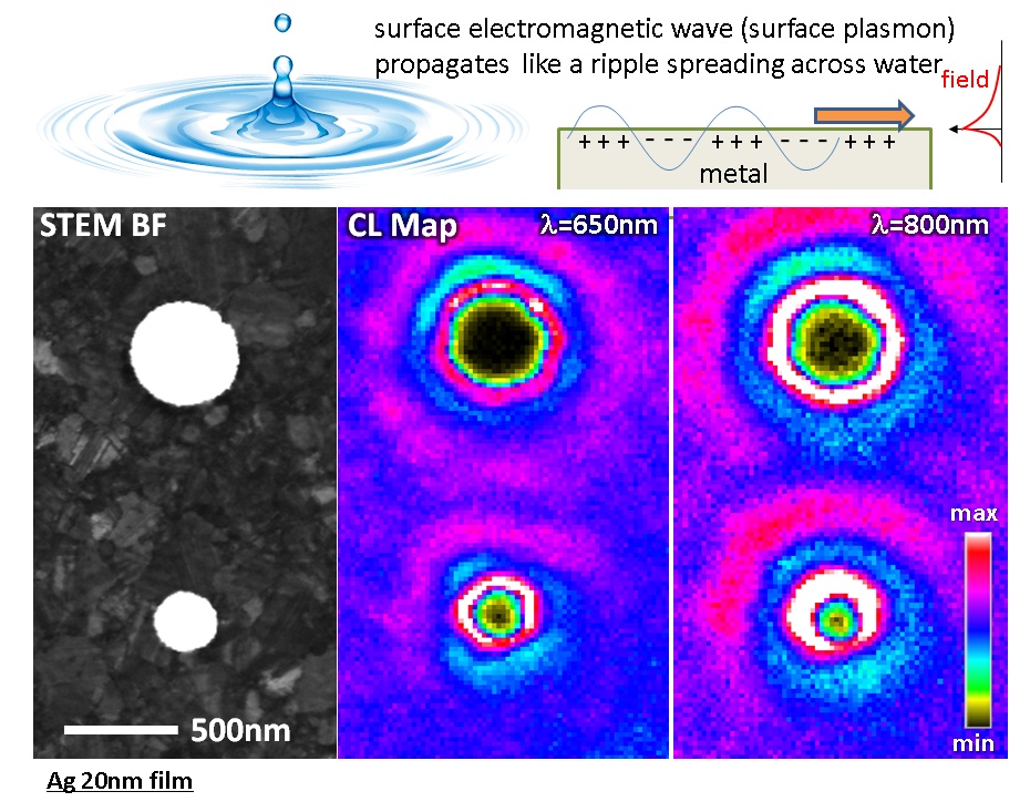 ナノフォトニック構造は、ナノスケールに光の場を閉じ込めるのが特徴ですが、通常、光の電場を波長(数百nm)より小さいサイズで観察することはできません。当研究室では、電子線を使って光を「可視化」しています。加速電子により励起されたプラズモンを放射光として検出し(カソードルミネセンス)、電子線を走査すれば、光の電場マッピングが1nmスケールで可能になります。自由電子の表面波である表面プラズモンが、あたかも水面を伝わる波のように観察できます。